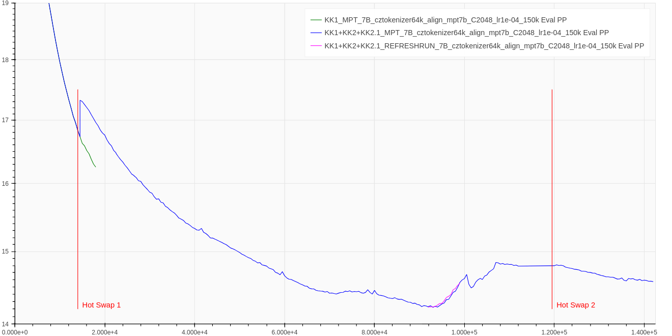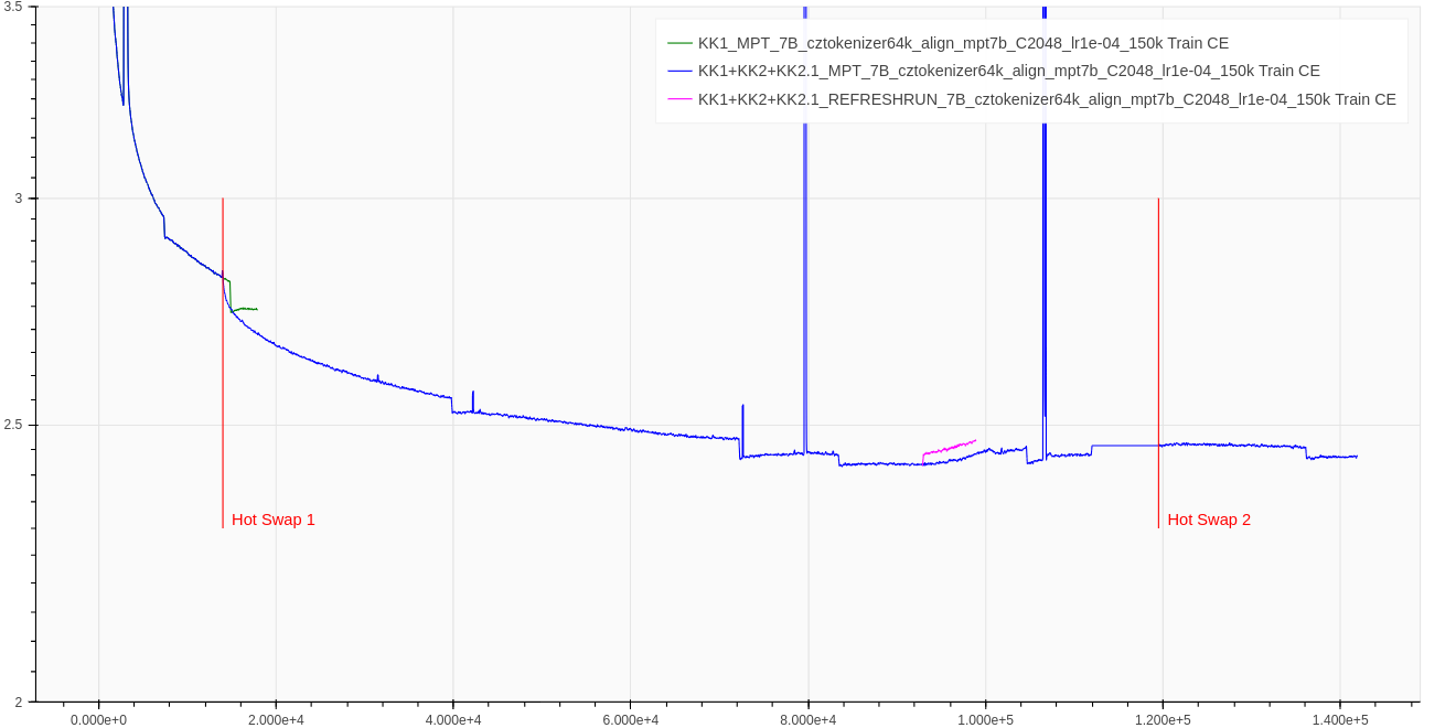 - (b) On step 94,000, the training loss stopped decreasing, increased, and around step 120,000 (near hot swap #2) started decreasing again. To ablate whether this was an effect of hot-swap, we resume training from step 93,000 using corpus #3.The optimizer states were reinitialized. Result: Neither corpus #3, nor optimizier state reinitialization seems to mitigate the issue of local divergence at step 94,000.