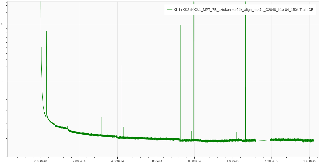 We encountered loss spikes during training. As the model always recovered, and our budget for training 7b model was very constrained, we kept on training. We observed such loss spikes before in our ablations. In these ablations (with GPT-2 small), we found these to be