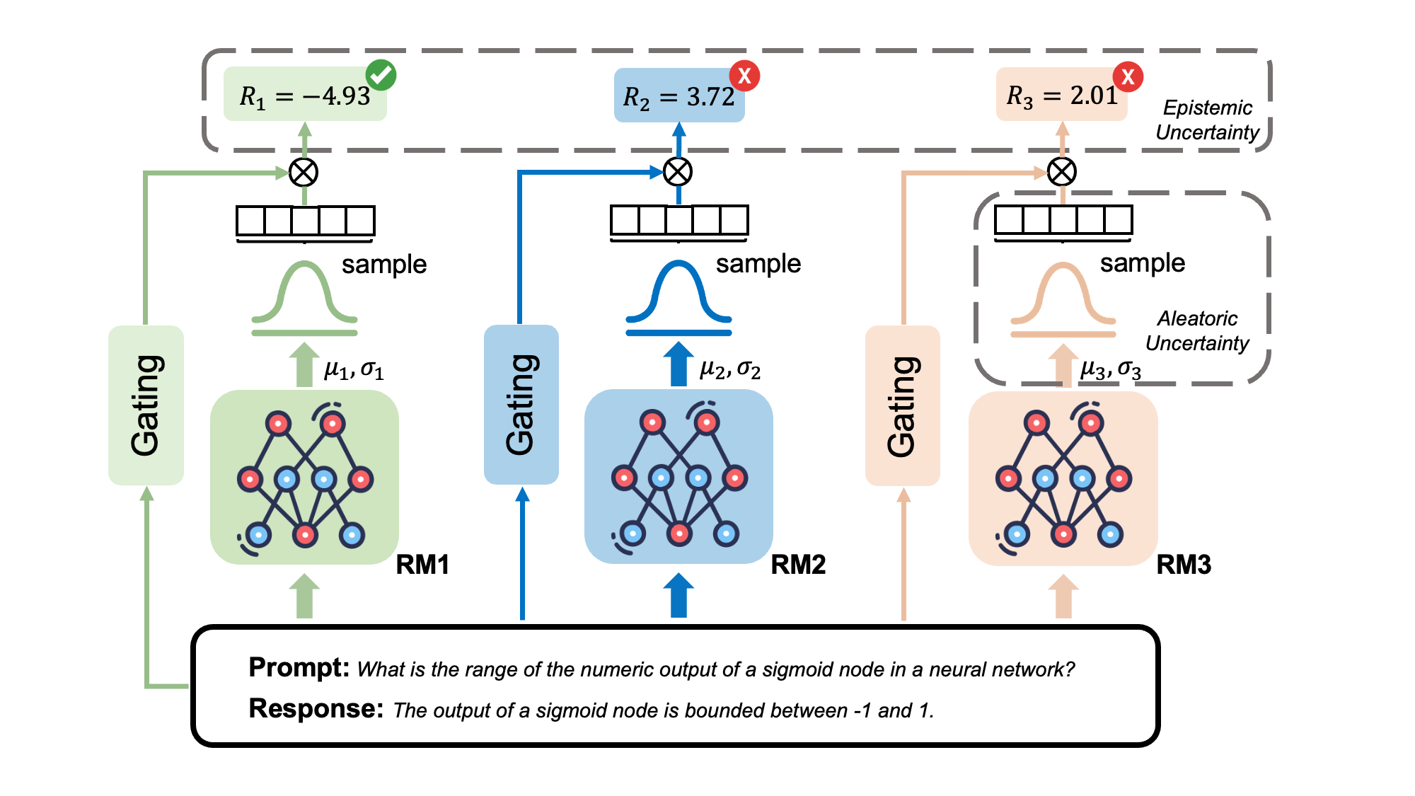 During training, instead of multi-attributes scores, outputs of the uncertainty-aware value head are parameters of a normal distribution, from which scores are sampled. Then we run regression on the outputs with the labels to train the value head. To enable gradient back-propagation, reparameterization technique is used.